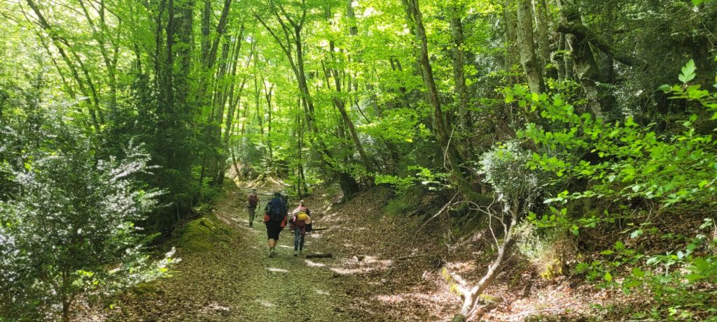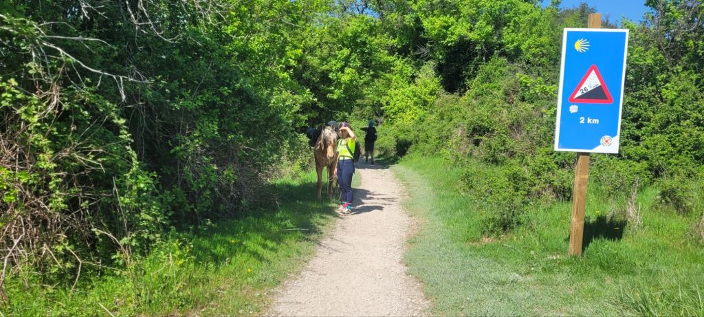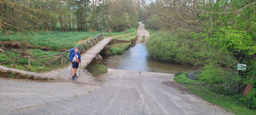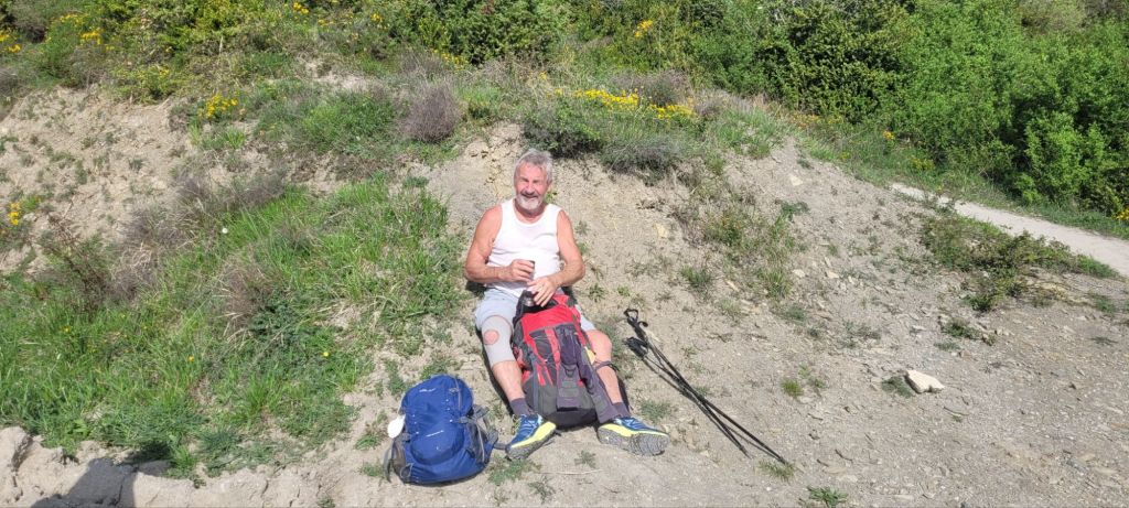 In the meet and greet, I love to watch people as they explain their reasons for walking. Some can hardly speak English, but you can see the passion in their faces. Some are grieving from the death of loved ones,even pets, or looking where their lives are at,religion, spiritual is a common one, comradiry and,looking beyond retirement, and lots other reasons. It’s very addictive, as many pilgrims have done more than one, including myself. Me?spiritual comes in for me, comradely, also time to reflect on my parents who have passed many years ago. Also I reflect about our grandson Teddy, how he was taken away from us at only three weeks old and I walk for Ashleigh and pray that she can keep the strength to guide Willa, Teddy’s twin to build her body to be able to live as a normal child. At two and a half she is slowly punching above her weight. Now, back to the way. Last night’s pilgrim’s meal was a delicious salad entree, fish and chips, some sort of cream and chocolate cake, beer and wine. Can’t complain. As my stomach muscles and knees, add in thighs,calves were now aching from two days of mainly climbing, I was happy to have an early night. This morning I didn’t exactly bounce out of bed, but left the albergue to get some miles in before breakfast. Started off quite cold, great for walking, but got considerably warmer as the day wore on. After about four kms we stopped, had brekky, and caught up with the welsh man. Those first few kms were pleasant gravel paths,the smell of cow shit going through my nostrils,I was sore but feeling good. Long day today,about twenty five kms.Some road work, a number of ups and downs over rocky ground, quite steep, but not as bad as yesterday. My body not recovered completely so at times had to stop as legs feeling like jelly. Jeff went missing and later on in the afternoon, we found out he had hurt his back,so he slowed down, but finally made it to the albergue about 5pm. Tomorrow he will use the luggage transport and walk without his pack