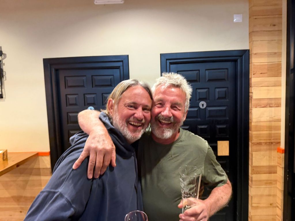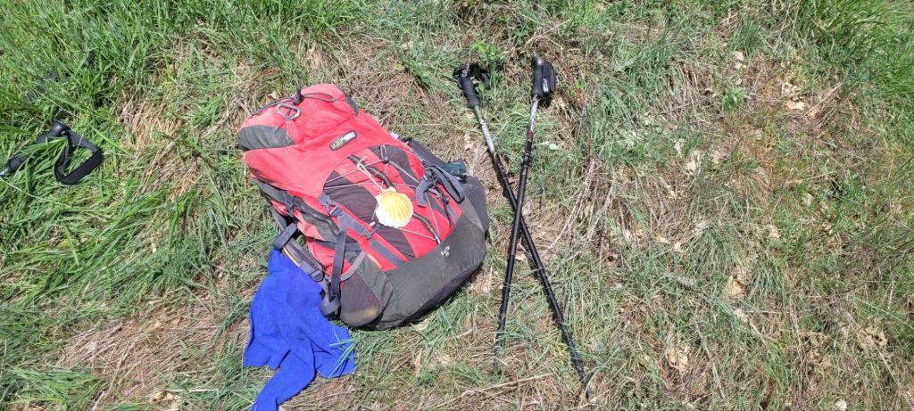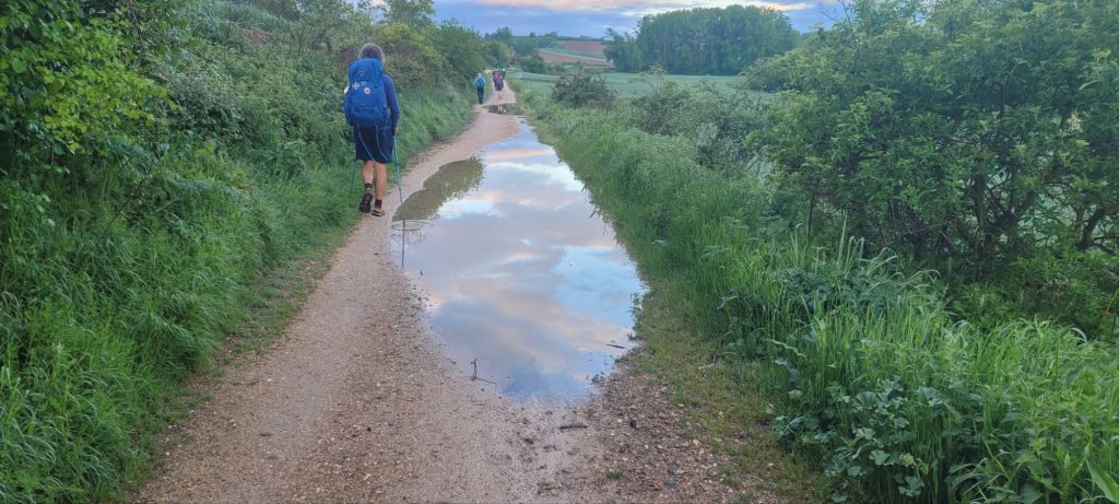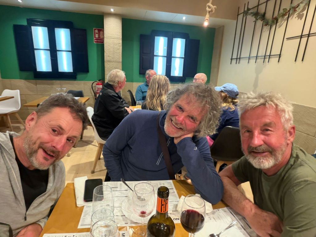 After a lovely hot shower, and a short rest, I looked out the window, and although the sun was shining, it was coming down very heavy, and the weather had become quite cold. I put on my thermals under my shorts and wore my jacket for the first time. I would have been happy to stay in our lovely fortress. Don’t know if I would have survived the night without food though. After the rain eased, it was only a one hundred metre dash to the bar. It was packed with pilgrims. We all chatted and drank merrily. Alistair,Jeff, Helen, Mark, and I popped across the square and gorged on some nice food, washed down with two bottles of wine. We shared some tapas, and I then had a tuna steak with roast potato slices. All main meals come with roast potatoes or chips. You really don’t see vegetables. My dessert was a delicious flam. Back at the bar, the talk was about possible shortages of accommodation, especially this weekend being a long weekend. Jeff and I were fortunate that Helen had booked a room with four beds, and we would share that at our next destination in San Juan.I also booked a room for Jeff and I for the following night in Burgos. At the end of the day, you don’t really want to walk on to another village looking for a bed, especially if you’ve walked a 25 km plus day. This morning cold start to the day. Heavy cloud,but bits of blue about. After six ks,still no rain and we found a cafe for breakfast. A couple of kilometres further, I felt I needed to go. Normally like clock work I go before I leave the albergue. That didn’t work out today. Just as I was looking for a bush, I spotted a town not far away and I was grateful to use the cafe’s facilities. The first twelve kilometres was very pleasant, apart from sections next to the freeway feeling the earth shake from the semi trailers roaring by. The next twelve was a lot tougher as there were some steep climbs. Also lots of water gathered on the natural paths,and a bit of mud, but nothing serious. The paths are a lot softer which is kinder to the feet. Jeff and I walked the whole way on our own today. Saw pilgrims, and chatted for a short time, but, just me and him. After the ascents and descents, I think Jeff must have sniffed some jet fuel, as all of a sudden he bolted. I managed to stick with him, and when he caught up with this young bloke,the youngster started to walk faster. Jeff took up the challenge, tilted his head back,looked across at his oponent, and went again. His oponent did the same. I was galloping by this stage to keep up. In the end, the youngster had nothing left and retreated. When I also passed, the young man looked defeated. After we arrived at San juan,a few minutes later our oponent arrived and told us, he was going to be next town, I thought he’s fit, but then I saw him get into a cab. Each to their own. Helen and Mark arrived after us and we booked into the albergue, and I was happy to get the pack off my back.