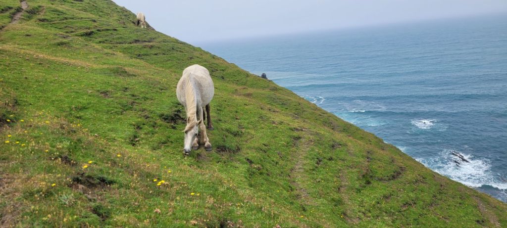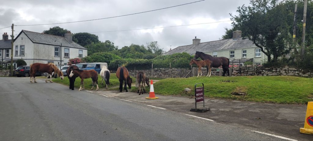 Today is going to be an emotional day. With the weather still terrible this morning, we decided to have a lie in and just have an easy morning before a forty minute drive to the railway station that would take Emily back to london.Good old mueseli again for brekky, packed our bags, thanked our wonderful hosts for a wonderful stay which included having all my clothes washed and dried and left the farm for the last time. Of course we made time for one more cafe for scones,jam and cream. The one we found was at the Minions,where we shared a memorable day yesterday. It was awsome seeing the foals across the road from the cafe running and playing like children. When it was time to leave for the station, we had to let the horses wander off the road before we could proceed. After hugging my daughter and saying goodbye, I drove for about an hour to drop the car back to the Newquay airport. I then caught two buses to get back to where I finished walking last Thursday. That time seems to have flown. Tomorrow, on my own, I will carry on walking.