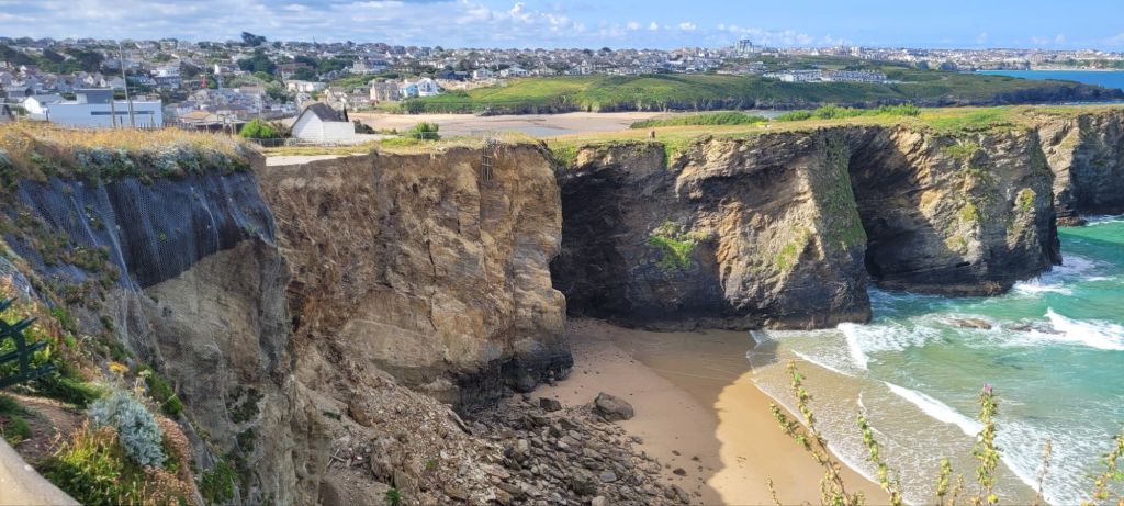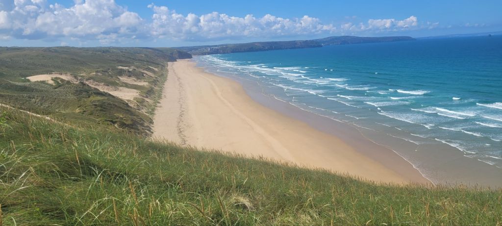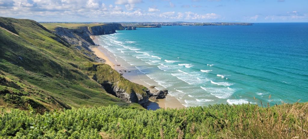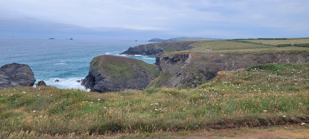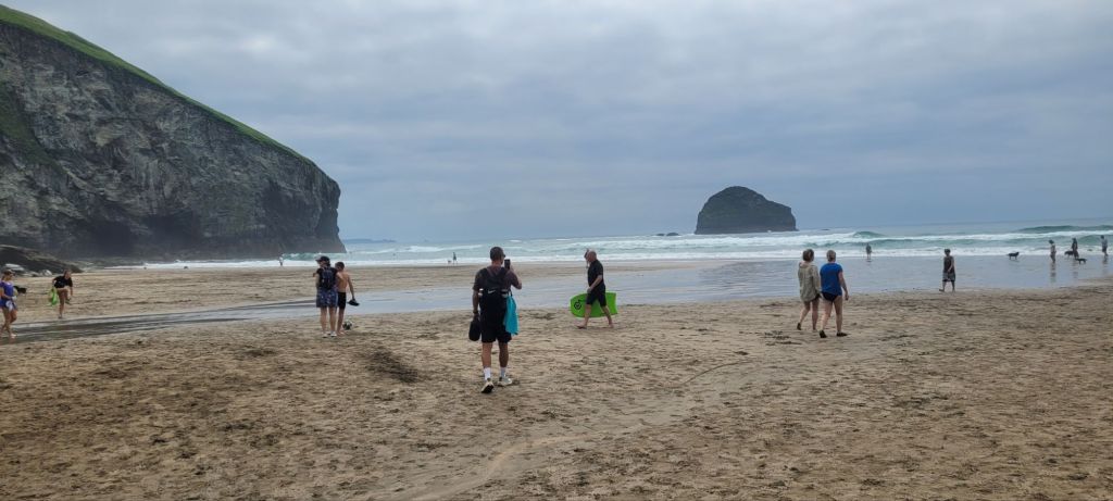 This morning we did things very differently. As we would be staying a second night, I didn’t need to carry my pack. Also had to catch a 7.30 bus to get to the starting point,whichmeantleavingwithoutbreakfast. It was easier to bus it to the next town and walk back the other way. Sounds confusing but it worked well. The bus, even out here, in what seems no where land, is a double decker, and with the extra narrow country roads,it’s amazing how they pass vehicles coming the other way. A half hour drive took an hour, with picking up people and school kids, and then watching vehicles backing back up for a long way sometimes to be able to let the bus through. Newquay is where we got off. It’s probably the biggest city in Cornwall. After a super fresh large Cornish pasty, we set off. A bit of road walking, plenty of flat coastal and beaches, and a couple of headlands made walking a treat. Also, the weather was much more moderate today and the scenery spectacular. Again talked to lots of people. People are very friendly. I guess lots on summer vacation, and locals enjoying rare a feast of summer. I’m loving it, as completely different weather to last year. After arriving back at yesterday’s finish point, I spoke to locals whilst waiting for the bus. When the bus arrived, I told the driver where to drop us, and he said he would if he remembered. I told him, if he didn’t, I would let his tyres down. Not sure if he took me seriously, but we got off at the right stop.